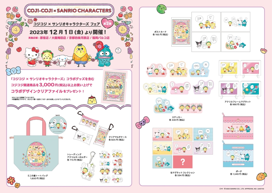 2023年12月1日(金)より、コラボレーションイラストを使用した新グッズを販売する「コジコジ×サンリオキャラクターズフェア 第2弾」をキデイランド4店舗で実施いたします。ミニ巾着トートバッグやポーチなど日常使いできるものから、どれが出るか楽しみなトレーディングアクリルキーホルダーまで、新商品が多数登場。キデイランド限定のお買い上げ特典もご用意しております。