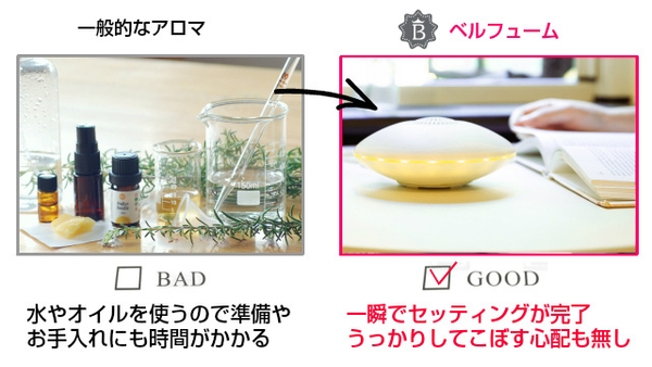 ええっ!こんなに簡単でいいの?(笑)水もオイルも使わないので、アロマ愛好家もびっくりしちゃうほどの「超時短セッティング」を実現しました。