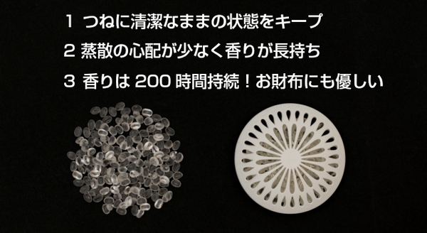 「つぶアロマ」と名付けた香りをコーティングしたアロマをカプセルにたっぷり詰め込めこんで。そのカプセルにディフューザーから風を送る事で心地よい香りを部屋中に届ける仕組みです。