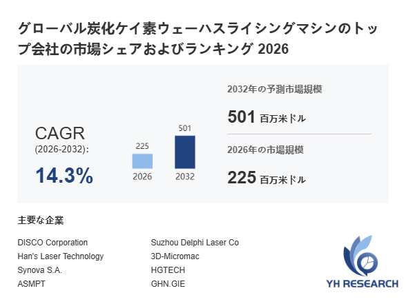 YHResearch調査チームの最新レポート「グローバル炭化ケイ素ウェーハスライシングマシンのトップ会社の市場シェアおよびランキング 2026」によると、2026年の225百万米ドルから2032年には501百万米ドルに成長し、2026年から2032年の間にCAGRは14.3%になると予測されています。