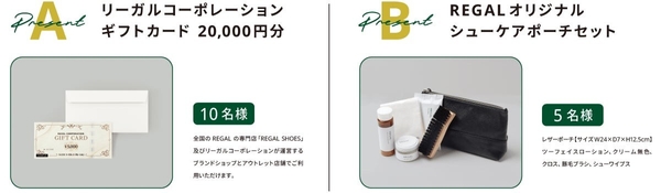 株式会社リーガルコーポレーション(本社:千葉県浦安市、代表取締役社長:青野 元一)は2025年10月31日(金)~11月16日(日)の期間中、REGAL SHOES、FIT-IN、R+ PLUS REGAL CORPORATION、REGAL ONLINE SHOPにてゴアテックス フットウェアの商品をお買い上げいただくと、リーガルコーポレーションギフトカード 2万円分またはREGALオリジナルシューケアポーチセットが当たるキャンペーンを実施いたします。