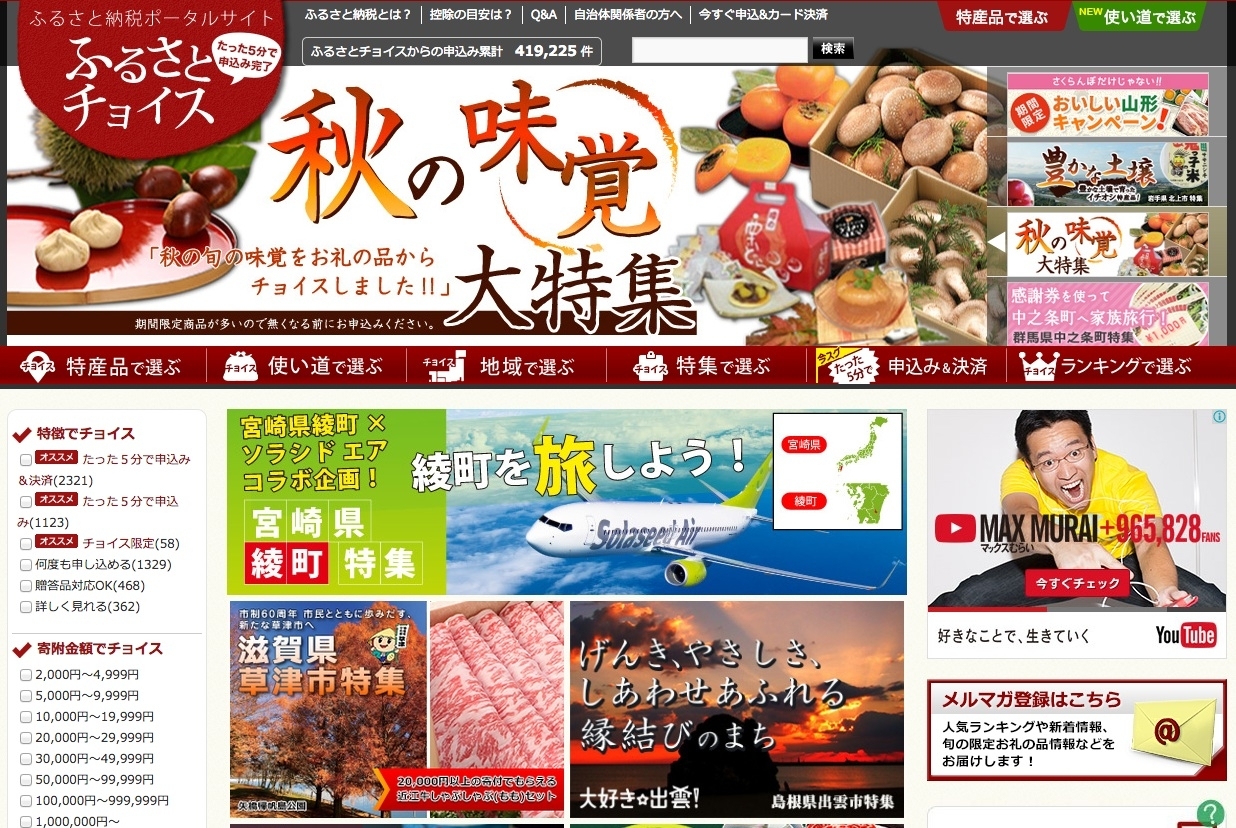 また、直近2014年9月-10月の1ヶ月間集計は、過去最多となる10万件以上のふるさと納税申込みがありました。