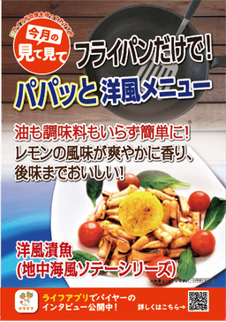 ライフが自信を持っておすすめする「今月の見て見て」の5月商品に選ばれた「洋風漬魚(地中海風ソテーシリーズ)」は、油や調味料不要、フライパン1つで簡単にメイン料理が完成します。調理時間は10分!魚介類は調理や後片付けが面倒というイメージがありますが、「洋風漬魚(地中海風ソテーシリーズ)」は、フライパンで焼くだけなので洗い物もフライパン1つ!調理・後片付けの時間を短縮できます。また、家庭ではなかなか挑戦しづらい”地中海風”の味付けのため、手軽に魚料理のレパートリーを広げることができます。