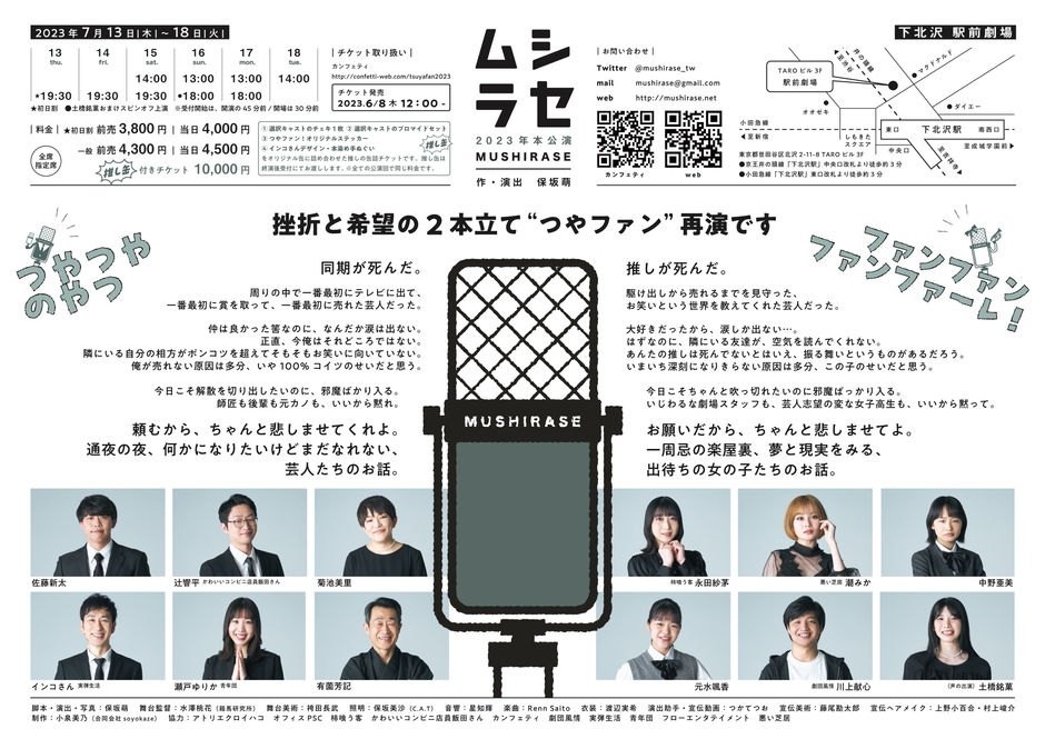 ムシラセ2023年本公演『つやつやのやつ』と『ファンファンファンファーレ!』が2023年7月13日 (木) ~2023年7月18日 (火)に駅前劇場(東京都世田谷区北沢2-11-8TAROビル3F)にて上演されます。