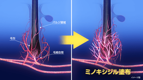 また、毛の材料を作り出す大もとの細胞である毛包幹細胞が存在する、毛包バルジ領域周囲の毛細血管密度も増加し、毛包幹細胞に接触する毛細血管の割合も増加することを確認しました。これらのことから、ミノキシジルは血管を介して、毛包の幹細胞に影響を及ぼすという新規のメカニズムが示唆されました。