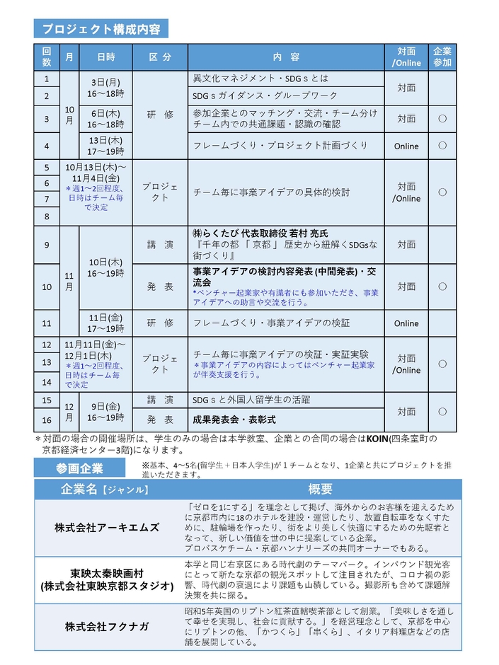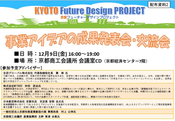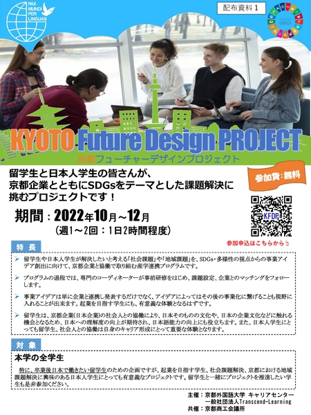 京都商工会議所と京都外国語大学では、京都企業におけるSDGs・多様性の視点からみた社会課題・地域課題の解決に向けて、留学生と日本人学生が京都企業の社員とチームを組み、新たな事業アイデアを創出する事業「KYOTO Future Design PROJECT」に取り組んできました。両者の産学連携事業としては初の試みとなります。概要につきましては添付資料①をご参照ください。