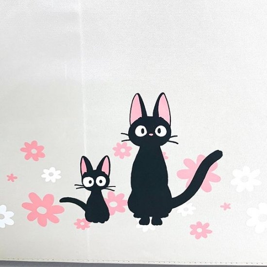 魔女の宅急便から黒猫のジジです。ピンクと白のお花に囲まれた和やかな風景にジジがちょこん♪隣のちょっとびっくりした表情の子猫も可愛いですね。