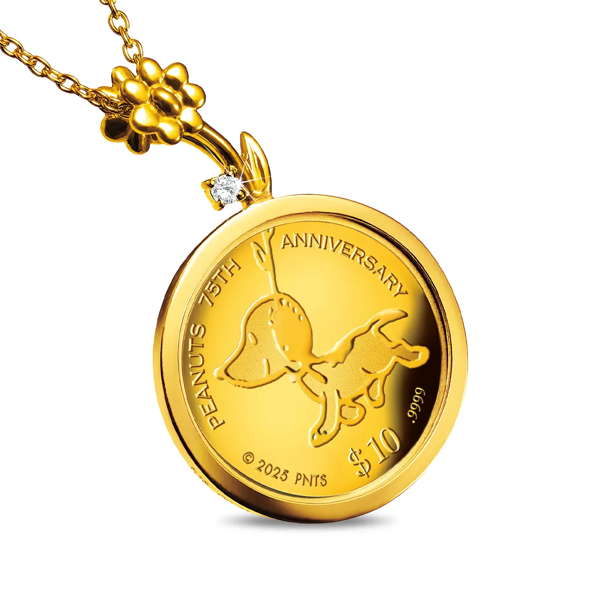 本品は、世界的なコミック「PEANUTS」の75周年を記念して限定発行された、正真正銘の金貨を使用した宝飾コインペンダントです。