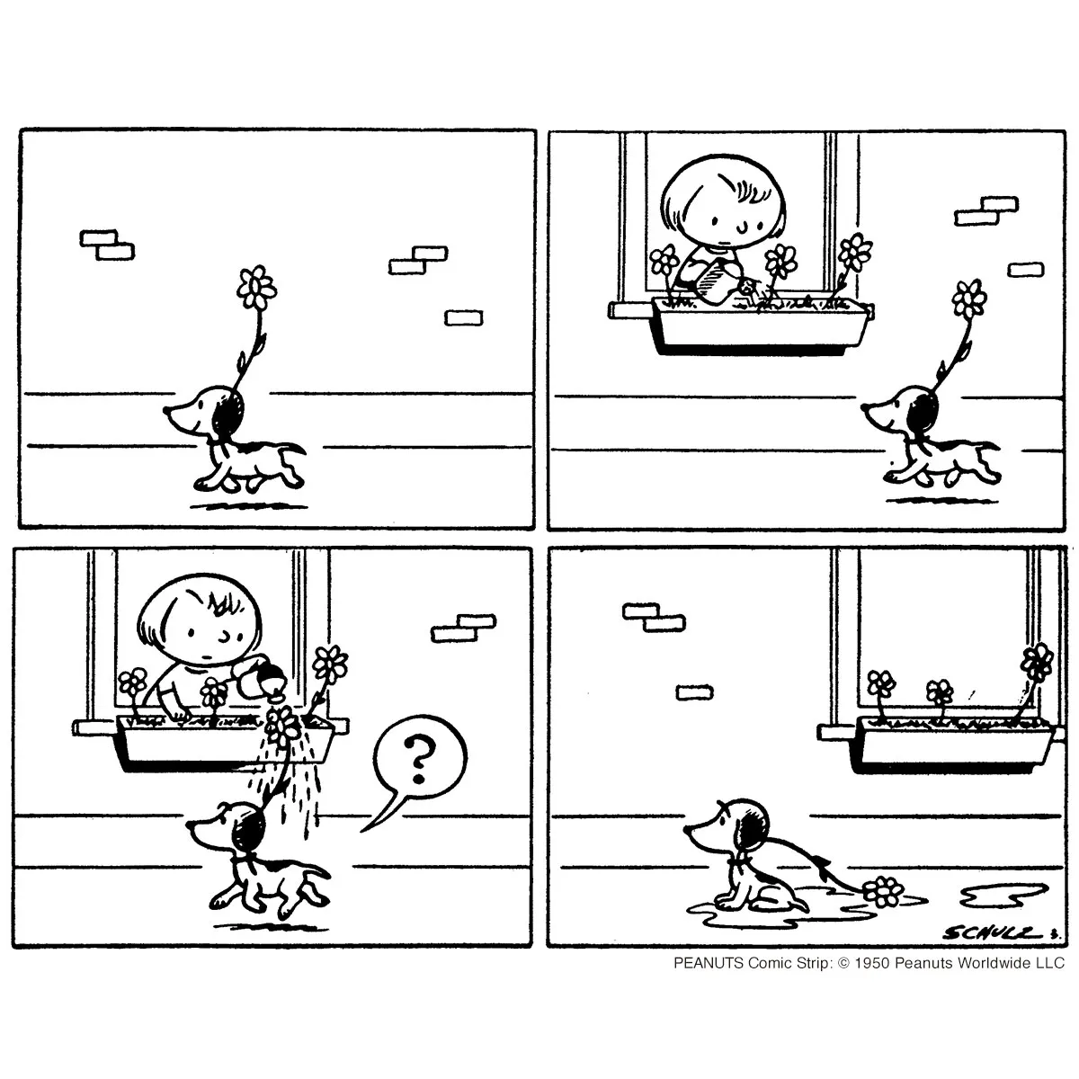■窓辺の前を通るとき、頭のお花に水をかけられて…。コミックのウイットなストーリーが純金の輝きとともに、見るたびに浮かび心を和ませてくれます。