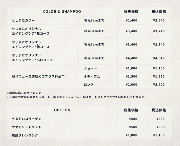 *全体染めの場合は上記に、ショート1,100円、ミディアム1,650円、ロング2,200円がプラス。