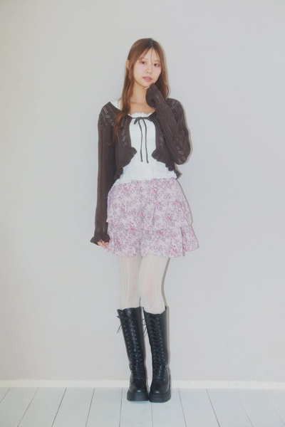 パフ袖ブラウス+ピタニット、ブラウス+スカーフ首巻き、小花柄フリルミニスカート、ピンクチェックプリーツスカート