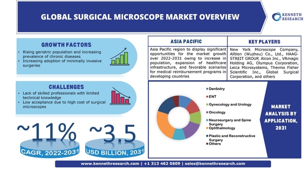 世界の手術用顕微鏡市場の成長は、高齢者人口の増加と慢性疾患の罹患率の増加によって推進され、2022年から2031年の間に約11%のCAGRで