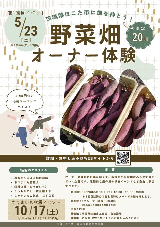 鉾田市観光物産協会(所在地:茨城県鉾田市大竹390)は、昨年度も大好評だったさつまいも畑の農業体験ができる「野菜畑オーナー体験」の今年の募集を開始しました。