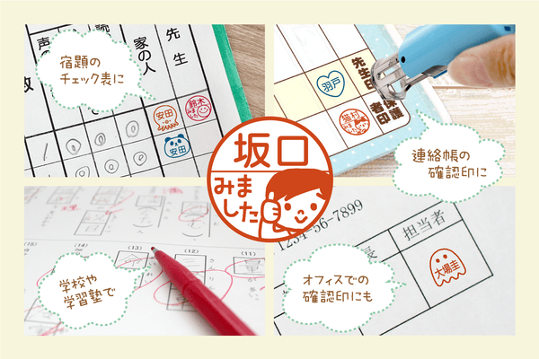お子さまの連絡帳や音読カードのサイン、塾や学校の先生が提出物に押す確認印に使える、かわいいイラスト入りの印鑑です。幼稚園・保育園の卒園記念品などにオススメです。