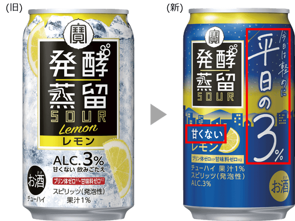 今回、“アルコール分3%で甘くなく、お酒の満足感が楽しめる、平日にぴったりなチューハイ”という商品コンセプトをより分かりやすく表現するため、~平日の3%~というサブネームを商品名に追加するとともに、パッケージデザインをリニューアルします。