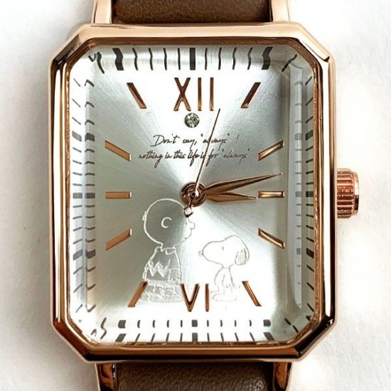こちらの文字盤には、スヌーピー&チャーリーブラウンがデザインされています。先程と同じくピンクゴールドで、大人の女性にピッタリ。