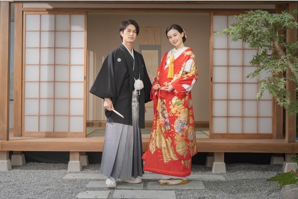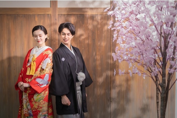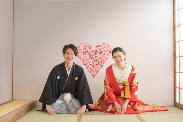 屋内庭園スタジオの中は、障子で仕切られた茶室と、砂利を敷き詰めた本格的な庭園。正座ショットで人気の掛け軸やハートの猪目窓もご用意しています。季節を問わず撮影できる桜や紅葉などのセットもあるので、天候を気にすることなく、ロケーションフォトのような撮影ができます。