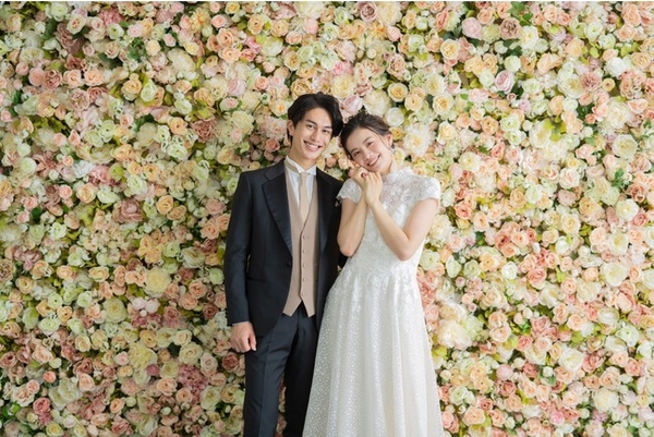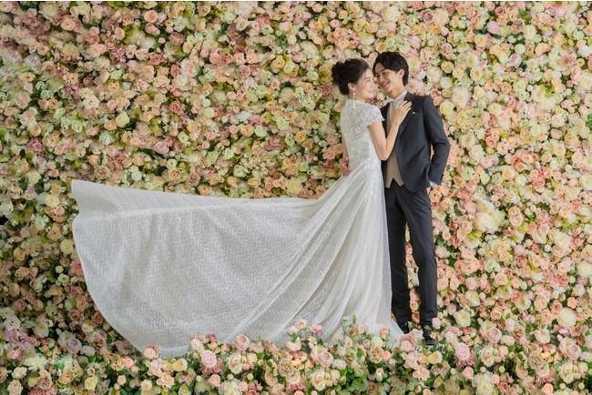 ハウススタジオには、頭から足元まで全面お花に囲まれた写真を撮影いただける人気のフラワースタジオを導入。サーモンピンクやアイボリー、イエローといったやわらかい色味で、ロマンチックな雰囲気とナチュラルな可愛らしさを併せもつ背景です。
