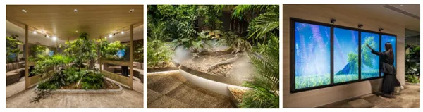 「植栽とデジタルの融合」をテーマに、最新技術と豊かな緑が織りなす特別な体験空間を実現しました。また、透明スクリーンを通した幻想的なグリーンビューに加えて、インタラクティブな4面サイネージと本物の植栽が一体となったアート空間、ミストや揺らめく風により五感を表現しています。生命力あふれる自然樹形の樹木により、人と自然が共鳴する新たなライフスタイルを美しく表現しており、まるで森の中に足を踏み入れたような心地よさと癒し「indoor rainforest」を体現する先進的な取組が、屋内緑化の未来を切り拓く好事例として、ご評価いただきました。