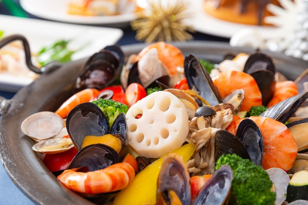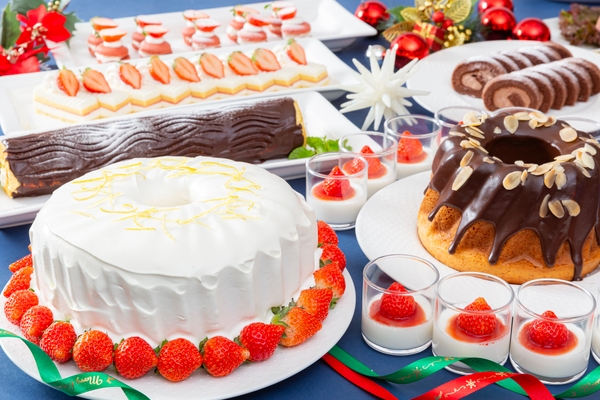 ビュッフェメニューには「カニとほうれん草のスパニッシュオムレツ」や「白甘鯛のワイン蒸し」、「鴨胸肉のソテー」など30種類をご用意。さらに「ブッシュドノエル」や「クグロフ」、「苺のショートケーキ」などクリスマスデザートも並びます。