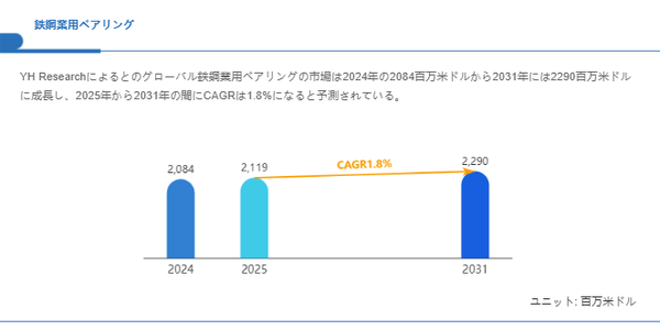 YH Researchによるとのグローバル鉄鋼業用ベアリングの市場は2024年の2084百万米ドルから2031年には2290百万米ドルに成長し、2025年から2031年の間にCAGRは1.8%になると予測されている。この成長は、技術革新や需要の高まり、産業構造の変化といった要因に後押しされています。