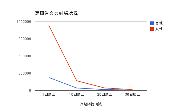 定期の継続回数1回以上、10回以上、20回以上、30回以上という条件で男性と女性の人数を計測したところ、継続回数が増える程男女の差が埋まっていきました。このことから男性の方が定期注文の継続率が高いことが判明しました。