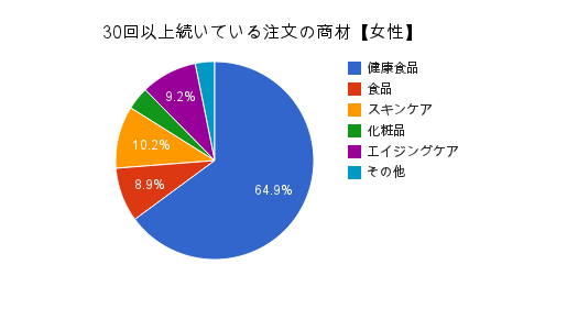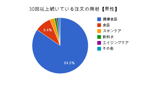 30回以上続いている定期注文34,087件中、男性7,361人、女性は14,728人でした。このうち71.4%にあたる15,785人が健康食品を購入しており、健康に対する関心の高さを確認することが出来ました。