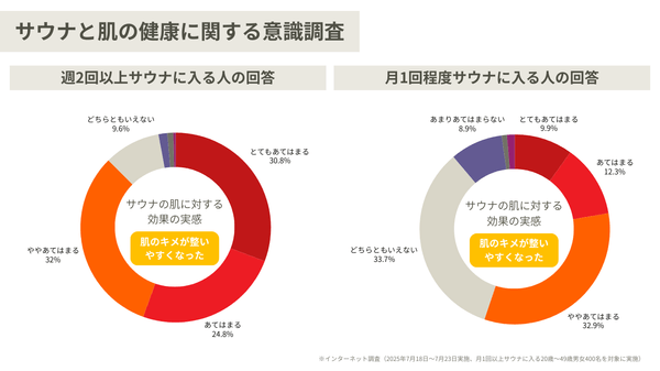 肌に対するサウナの効果の実感として「肌の調子が良くなった」という項目に「ややあてはまる」~「とてもあてはまる」と答えた人の割合は、週2回以上サウナに入る人で89.7%、月1回程度の人で68.9%でした。