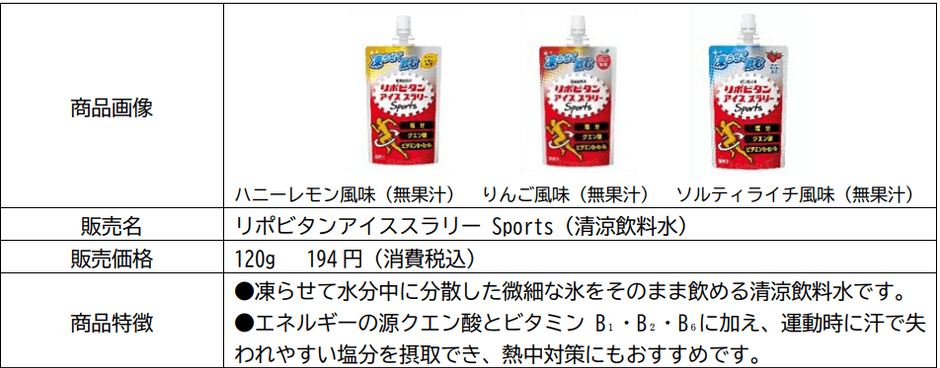 そして注目は、当社から奥宮選手に製品を提供している「リポビタンアイススラリー Sports(清涼飲料水)」。味の美味しさに加え、塩分・クエン酸・ビタミンB₁・B₂・B₆の栄養が摂取できる点を高く評価。「量もちょうど良く、走った後の楽しみにしている」と語るその姿からは、熱中症対策が“習慣”として根付いていることがうかがえます。