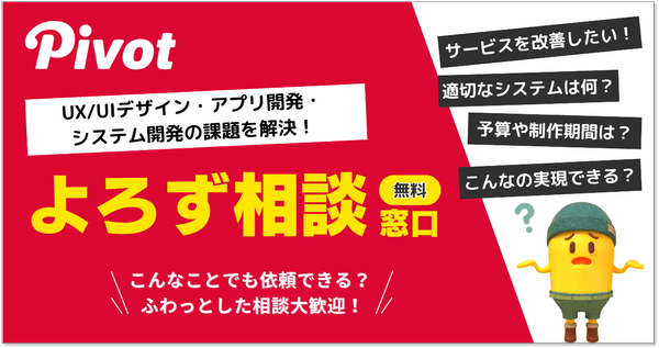 株式会社PIVOT(https://pivot.jp/)は「ユーザーの最高体験」を追及、WEBサイト制作、アプリ開発、システム開発のUXデザイン、UI改善、企画から実装、運用に至るまでワンストップでサポートさせていただいております。