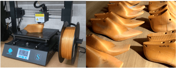 靴型の材料はPLA樹脂(ポリ乳酸)という植物由来の材料を利用。トウモロコシなどの植物から生成されるため、コンポストなどに入れれば土にもどる環境に優しい材料です。靴型を3Dプリントにより造形するためゴミ0の製作を実現しています。従来の靴型はプラスチックの塊から削り出す方式で作っていました、3Dプリントでは必要な分の材料を押し出して積み上げる方式のためゴミ0で靴型を実現します。