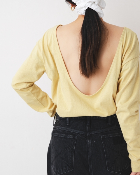 今回はonitの新作のラフィー天竺バックオープンロングスリーブTシャツを国際女性デーのシンボルカラーであるミモザ色に因んで、イエローに別注。