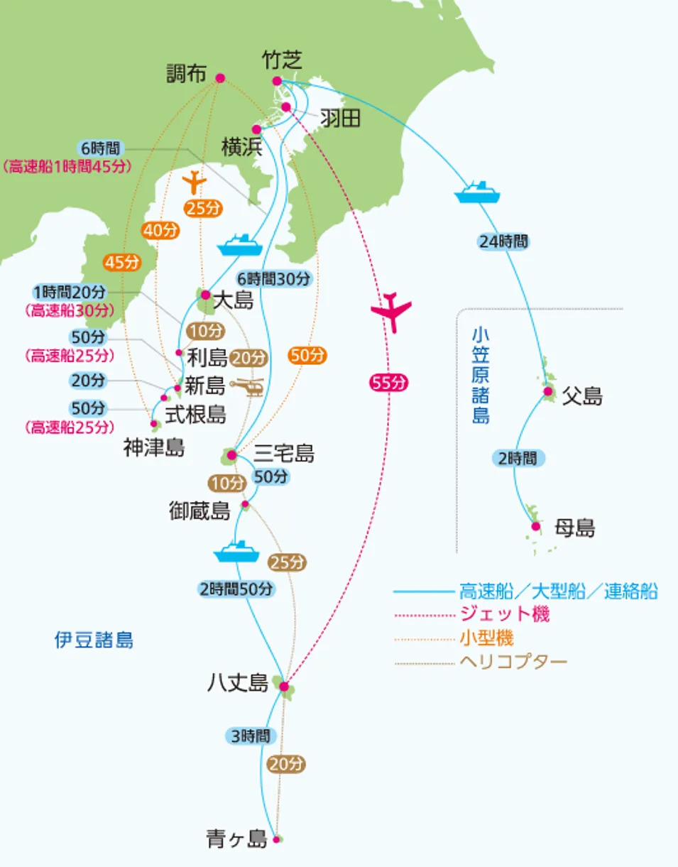 | ■主な島々 ・大島:火山とツバキの島 ・利島:サクユリと20万本ものツバキが彩るネイチャーアイランド ・新島/式根島:自然美と伝統文化が残る“二つの島” ・神津島:岸壁と砂浜が織りなす伝説の島 ・三宅島:野鳥が群れる自然美の島 ・御蔵島:イルカに出会える秘境の島 ・八丈島:黒潮の海がつくった南国の楽園 ・青ヶ島:独特の自然を持つ火山島 ・小笠原父島・母島:独自の生態系が残る世界自然遺産の島々 |