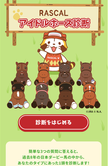 「JRA×ラスカル 第90回日本ダービーキャンペーン」専用サイトにて、3つの簡単な質問に答えると、ラスカルが過去8年の日本ダービー馬の中から、あなたにぴったりな1頭を診断するコンテンツを体験いただけます。さらにJRA FUN公式Twitter「@JRAFUN_Official」をフォローして診断結果をTwitterでシェアすると「JRA×ラスカル 限定アイドルホース」が抽選で500名様に当たります。