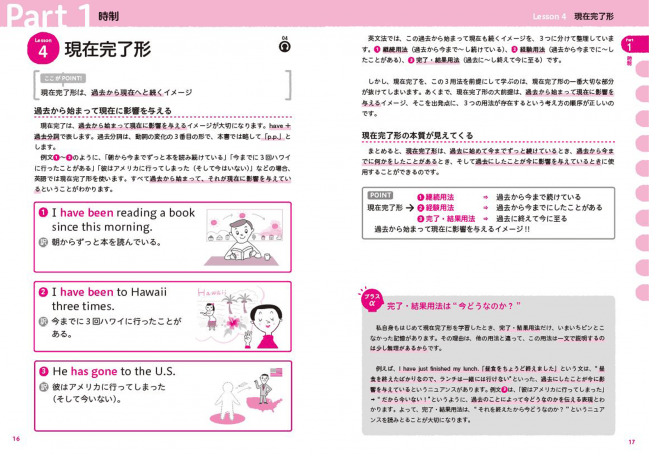 →各レッスンの「+α」のコーナーやコラムでは、応用文法や英文法の豆知識を掲載しています。「mustは“超おすすめ”の意味で使える」や「過去形や進行形を使うとなぜ丁寧になるのか」など、英文法を極めたい方に適した内容も紹介しています。
