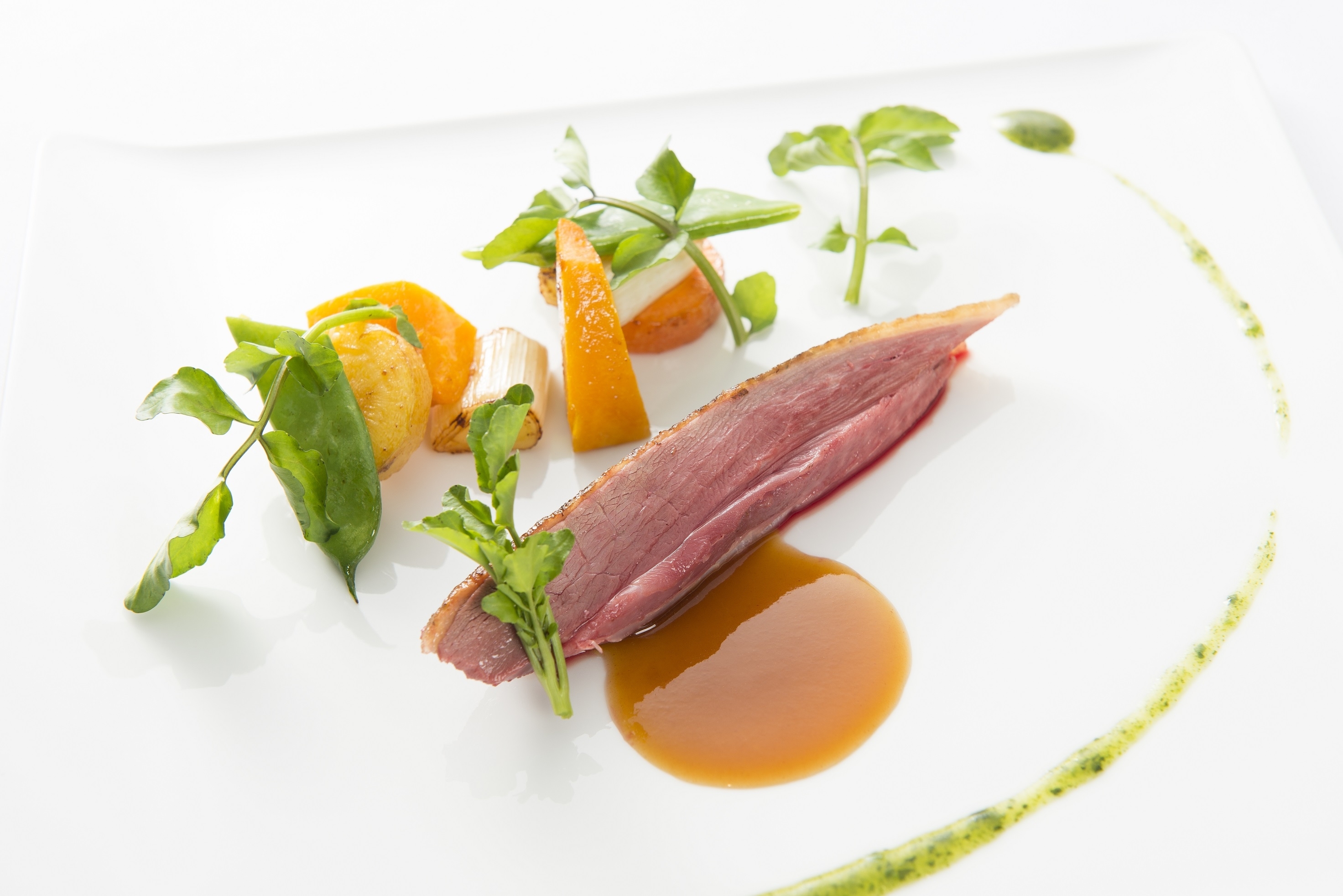 今回、鏡シェフは新潟県内を回り、五泉市では“極上のさといも”として知られる「帛乙女」、南魚沼市茗荷沢では厚みと大きさ、そして素晴らしい味を兼ね揃えた「八色しいたけ」、また長岡市山古志では天日干ししたコシヒカリの稲わらを与えることで最高の肉質を実現したタカノファームの「にいがた和牛」など、数多くの名食材と出会いました。中でも今回のコース料理でご提供する鴨は、新潟市西蒲区にて網猟で丁寧に捕えられた「潟東の野鴨」を使用し、狩猟解禁となる11月15日に合わせてコース料理提供期間を設定するほどこだわりました。
