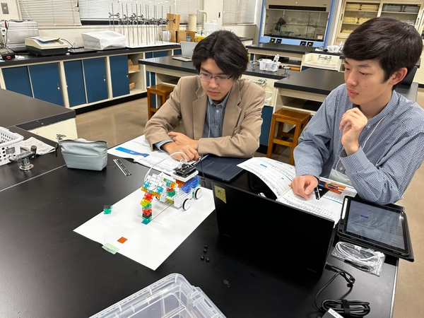 本講座では、高校で数学・物理を学ぶ意義を実感することを目的に、ロボットアームを有する移動ロボットを使って、理論を学び、理論に基づいたプログラミングを行いました。通常の授業でロボットに触れることはないため、試行錯誤しながらロボットを組み立てながらも、意欲的に取り組む姿が見られました。講義後のアンケートでは、「数学や物理の学びの先につながる応用や発展について、その一端をイメージできた」と全員が回答しました。