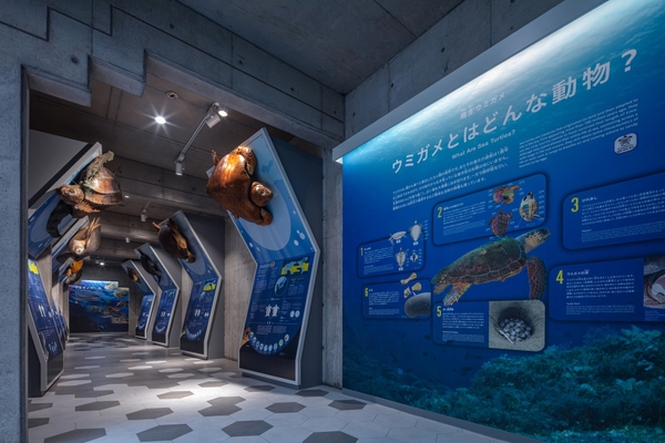 2億年ものカメの歩みをフロア全体に描いた「カメの進化」や町とウミガメとの70年の歴史を追体験する「ウミガメと共に歩んだ町」、バーチャルゲームを通して減少要因を知ってもらう「環境問題とウミガメ」、保護関係者に加わるための実践方法を紹介した「ウミガメの調査活動」など、楽しく学べる内容を満載。