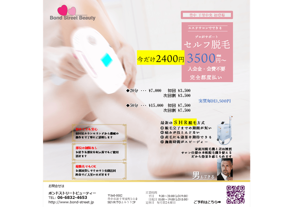 ボンドストリートビューティー(大阪府豊中市)は豊中・千里中央にて創業27年の総合美容サロンです。当店ではコロナ禍において美容がどうあるべきかの一つの提案としてセルフ脱毛を当地では初めて導入することといたしました。20分3500円と格安となっておりますが、いまなら特別クーポンご利用でさらにお得に脱毛体験可能です。