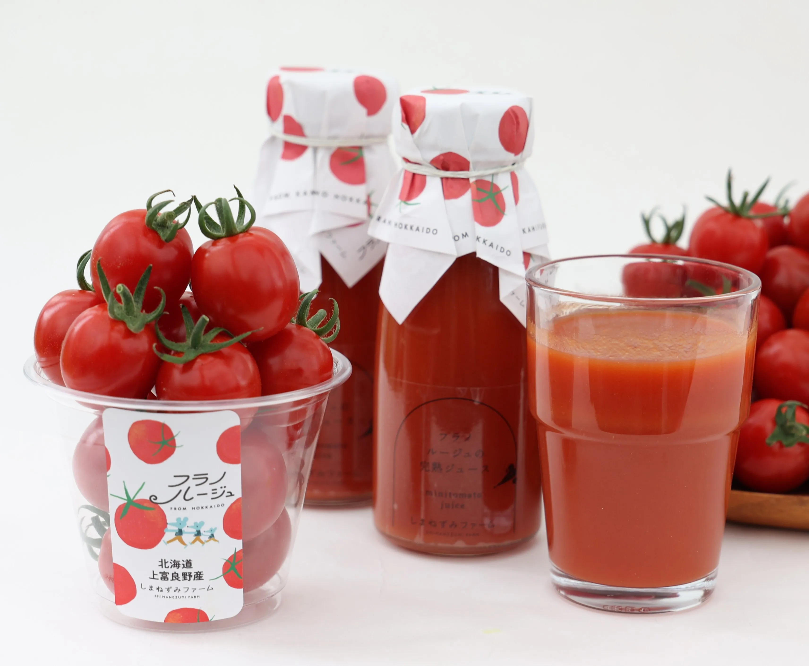 上富良野町<しまねずみファーム>ミニトマト 1カップ 400円・フラノルージュ ミニトマトジュース 1本 756円(第1弾)