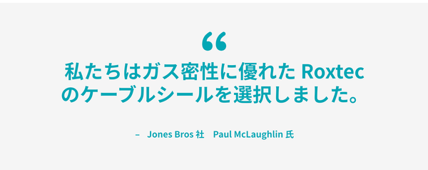 Jones Bros 社の副代理人である Paul McLaughlin 氏によると、「地中ガスが発見されたので、潜在的な有毒ガスから守るために配線の管路口を密閉するソリューションを必要としていた」ところ、「設計を担当した Tony Gee 社 が Roxtec を薦めてくれたため Roxtec を選ぶことにしました」
