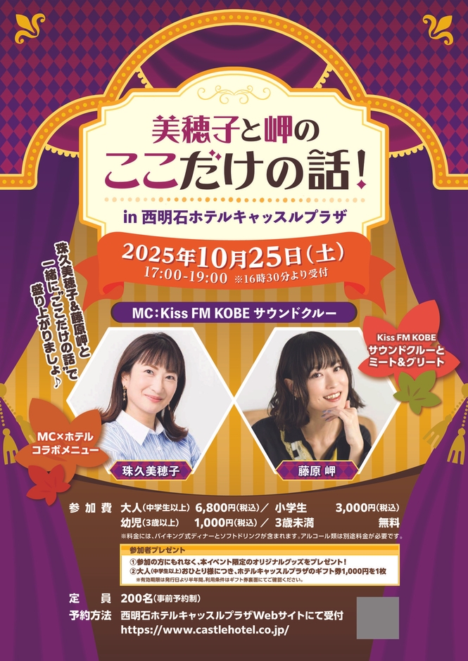 西明石のホテルキャッスルプラザ(兵庫県明石市)では10月25日(土)、FMラジオ局「Kiss FM KOBE」の人気サウンドクルー、珠久美穂子さんと藤原岬さんが出演する「美穂子と岬のここだけの話! in ホテルキャッスルプラザ」を開催いたします。季節感あふれるディナーとお二人の限定コラボメニューをご用意。本日9月5日(金)より予約受付を開始します。