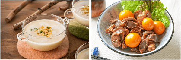 左:秋と言えば思い出される食材を使った「さつまいもの冷製スープ」。やさしい味わいを食事のスタートにスパークリングワインやオレンジワインと合わせてお楽しみください。