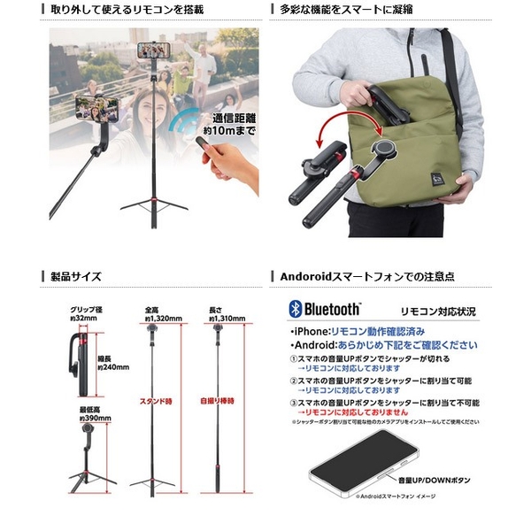 自撮り棒時にグリップから手を離さずに手元でシャッターが切れるBluetooth対応リモコンを搭載しています。スタンドとして使用する場合には、リモコンを取り外して離れた位置(約10mまで)からシャッターを切ることができます。