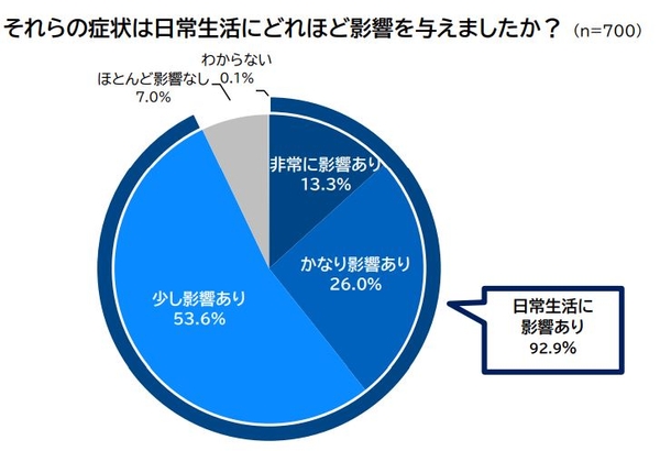 さらに、それらの症状により日常生活に影響があったと答えた方は92.9%にのぼり、「かなり・非常に影響がある」と答えた人も約4割に達していました。