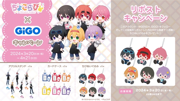 Xアカウント(https://twitter.com/GENDA_GiGO)から発信する該当のポストをリポストされたお客さまの中から抽選で3名様に「ちょこらびちびぬいぐるみコンプリートセット」をプレゼントいたします。