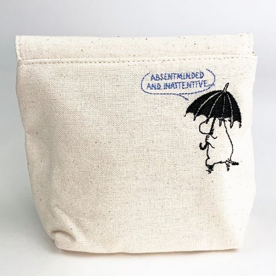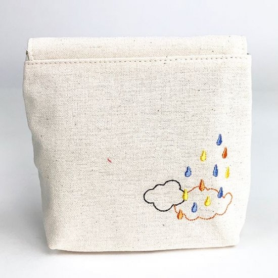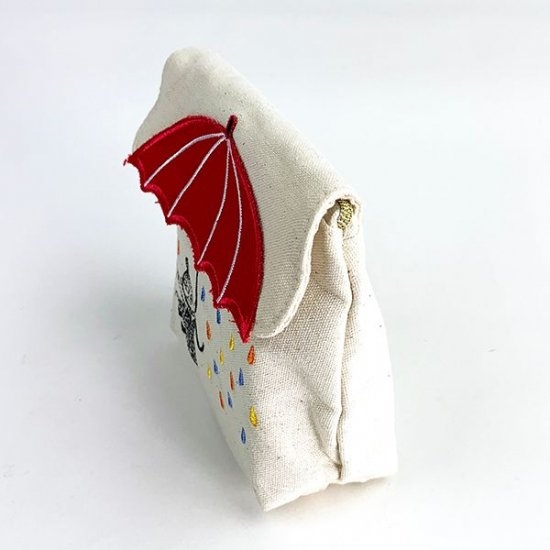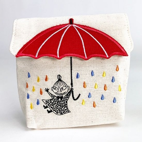 雨の中、赤い傘を差したリトルミィの楽し気なデザインのポーチです。カラフルな色の雨が刺繍されていて、とってもかわいいんです。赤い傘はフタの部分についていて、ちょっと変わったデザインになっています♪