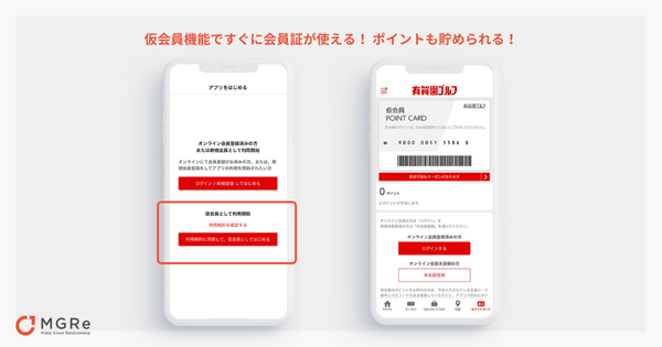 アプリインストール後、会員登録は後からでもOK。仮会員として会員機能の利⽤が可能。