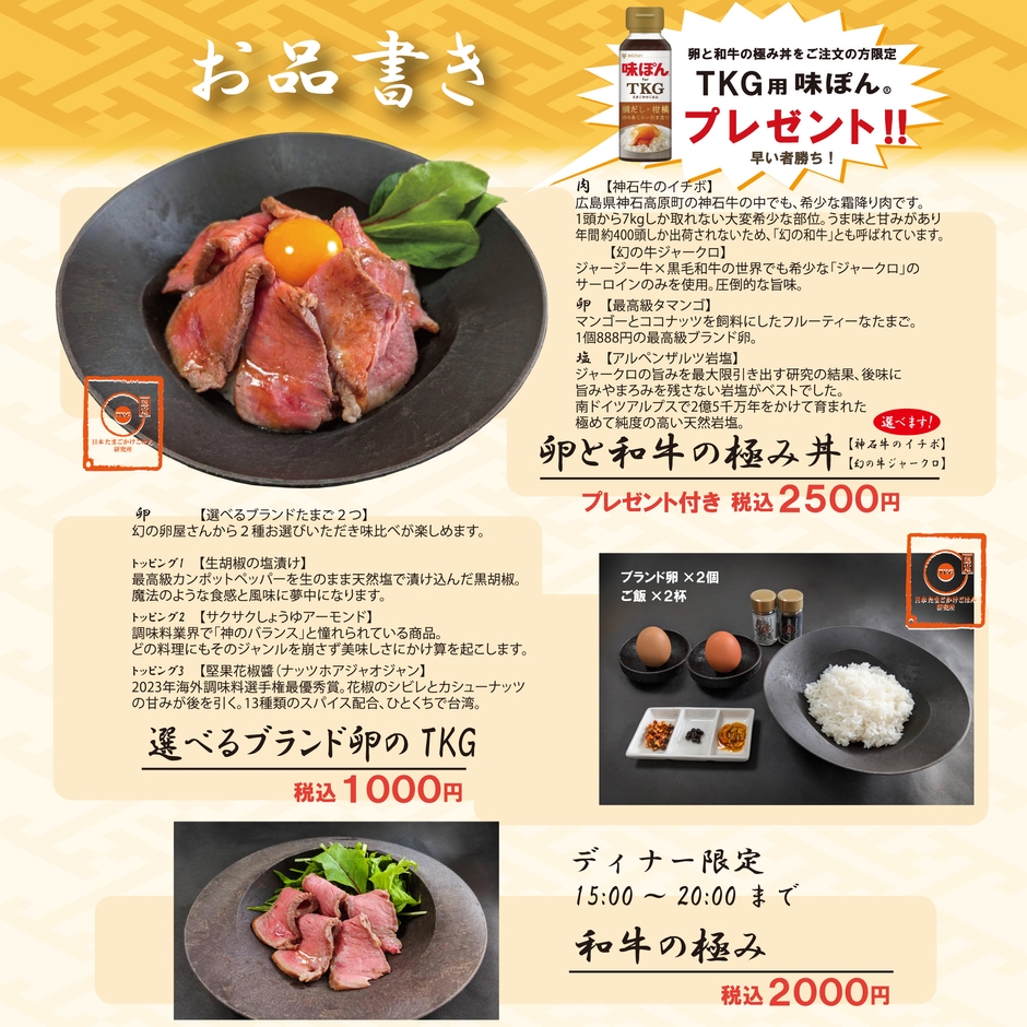特典として、卵と和牛の極み丼ご注文の方先着500名様にたまごかけごはん専用ぽん酢「味ぽん®︎forTKG」をプレゼント!早い者勝ちとなります!