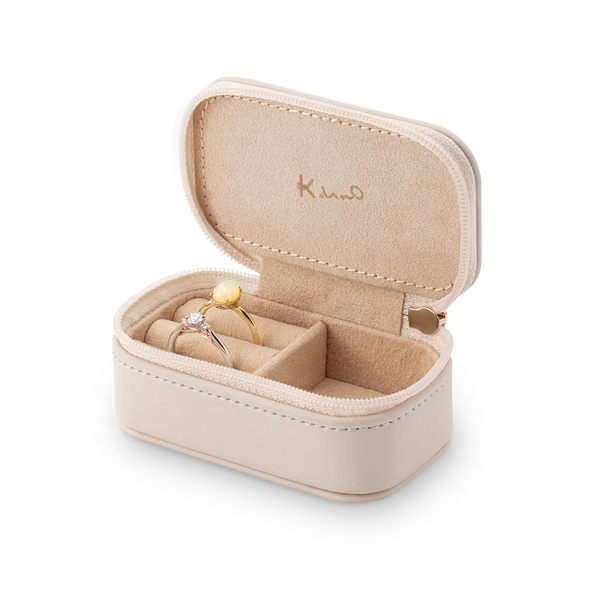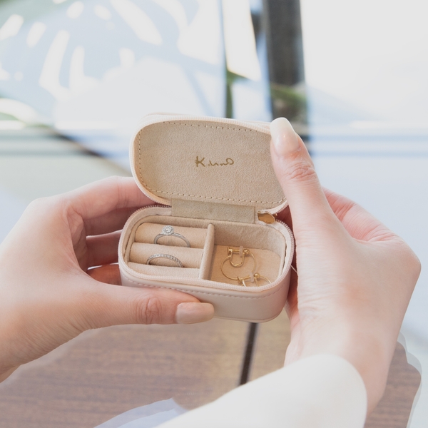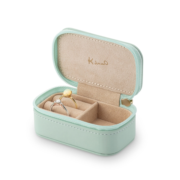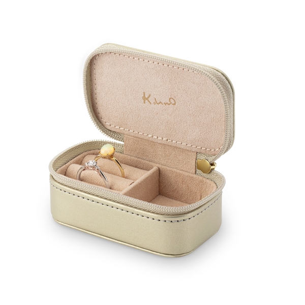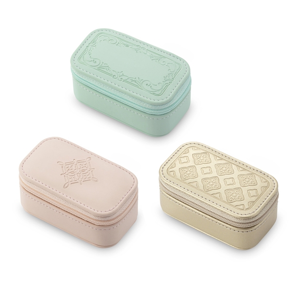トレンドのニュアンスカラー「アイスグリーン」「パウダーピンク」「シャンパンゴールド」に、天面の模様は異なるデザインで展開。バッグにしのばせてお出かけしたり、ご自宅でジュエリーを収納することに使用できるアイテムです。